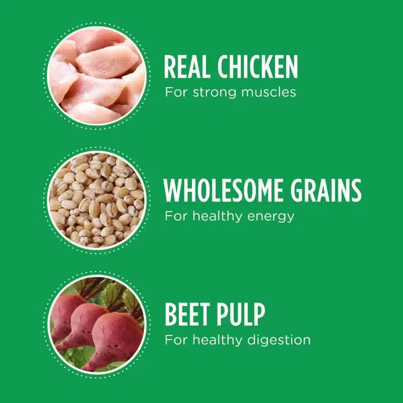 • 1st ingredient is real, farm-raised chicken, and features smaller kibble size