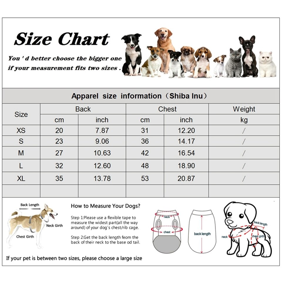 5. Usually Choosing the Size by Measuring in Chest, Back Length and Neck, Not Weight or Breeds Merely. Please refer to Size Chart before Shopping