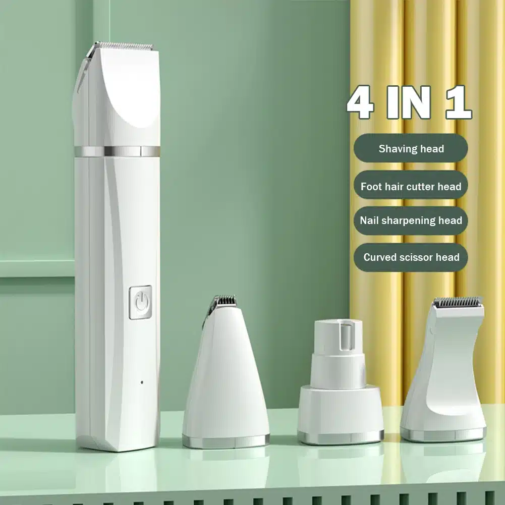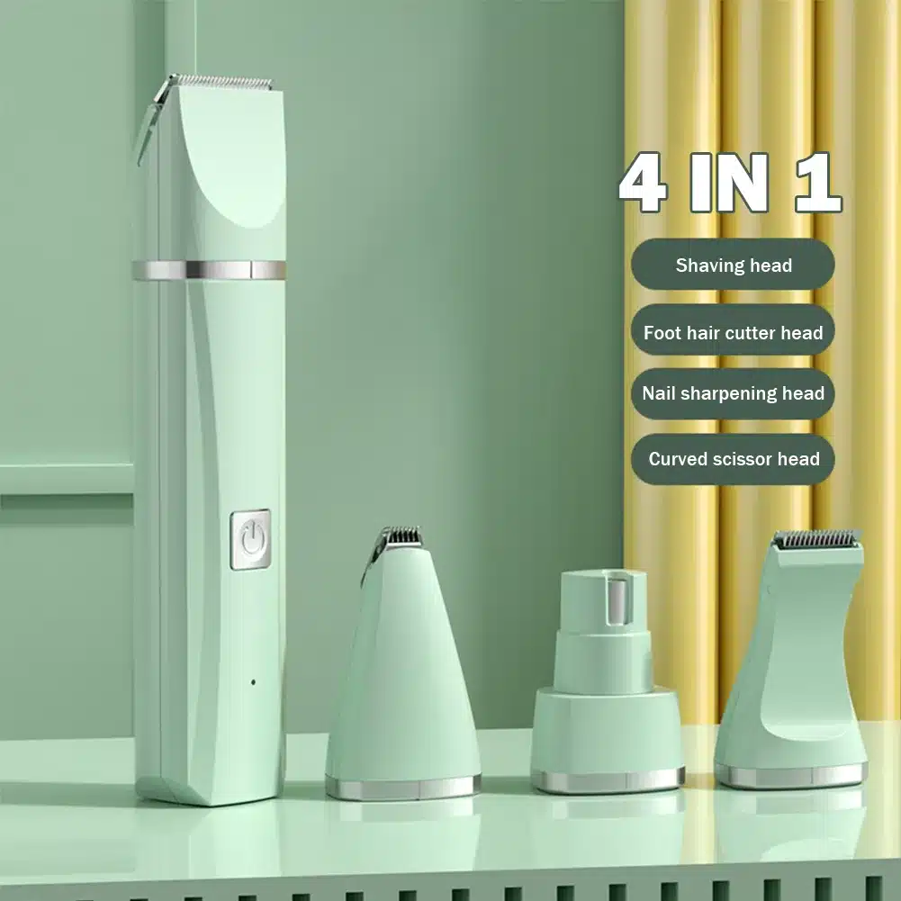4 in 1: equipped with shaving blade, foot hair blade, nail sharpening blade, and curved scissors head.